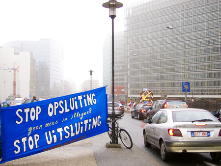 09.Dec.09 - on the morning of the 2nd of december 2009 about 50 noborder activists managed to block the entrance of the EU council building displaying banners with slogans aimed against the introduction of another 5 year programme of death and detention aimed at migrants attempting to establish themselves in europe. After about 5 minutes the activists pushed back the activists from the council building and the protest was continued for another 2 hours on the other side of the street in front of the Berlyamont building (the seat of the EU commission).